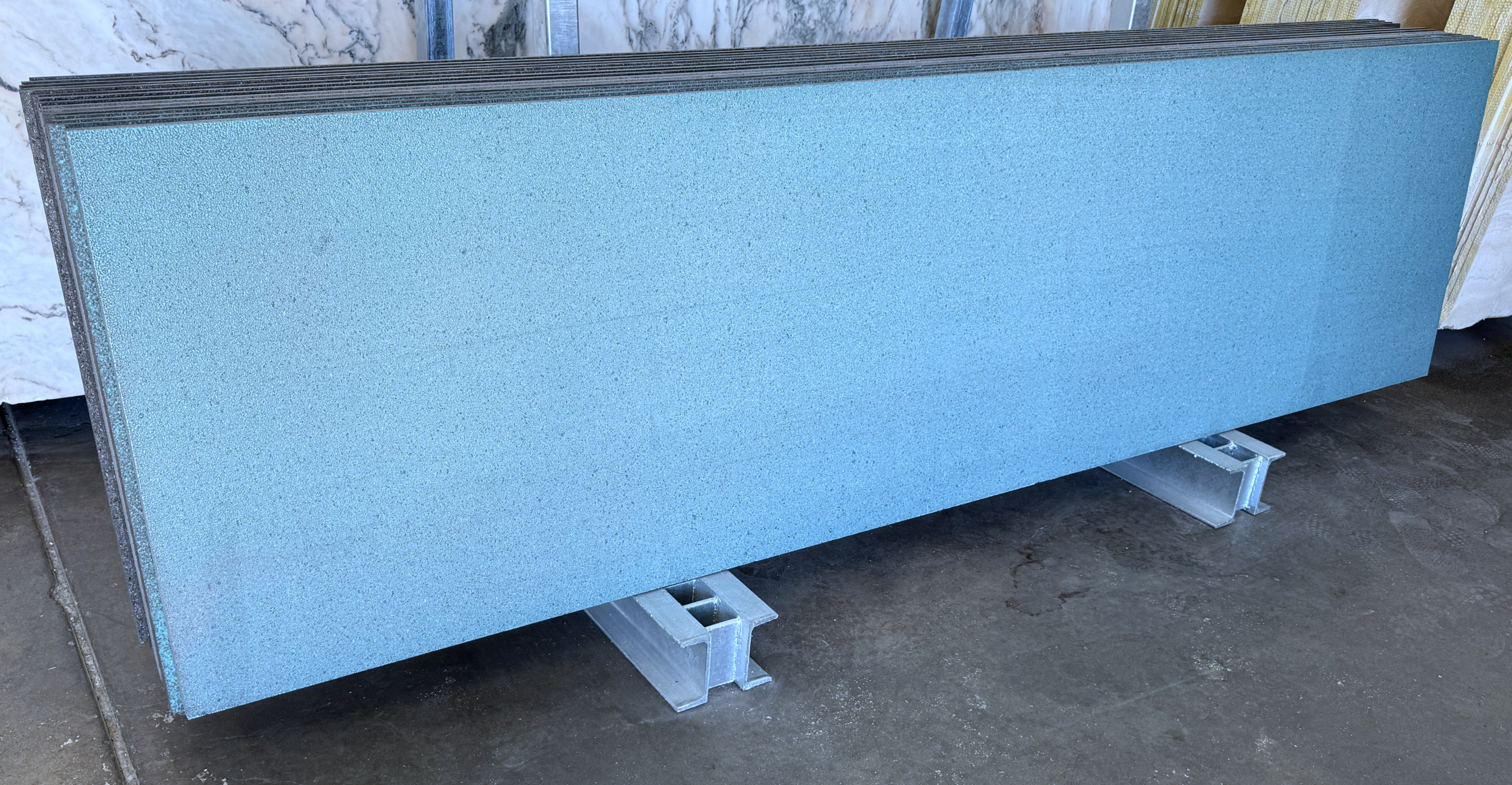 For example, these turquoise basalt slabs work perfectly for flooring in kitchens, bathrooms, or entryways. They deliver tough, stylish surfaces that handle heavy use. In addition, wall cladding creates dramatic accents with shimmering turquoise tones. Countertops gain a luxurious, standout look in homes or commercial spaces. Decorative elements like accent panels or custom features shine with this rare material.